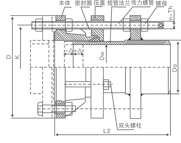 雙法蘭松套傳力補(bǔ)償接頭,通過長螺柱將接頭連接為整體,主要解決泵、閥等設(shè)備與管道的連接。在設(shè)備、管道安裝及維修時,可根據(jù)現(xiàn)場情況靈活調(diào)整安裝尺寸。正常運(yùn)行時,可以將軸向推拉力傳遞至整個管路,保護(hù)泵、閥的安全。該系列產(chǎn)品在城市給排水、污水處理等行業(yè)的流體輸送管線上被廣泛使用。
